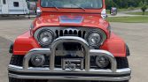 The body is finished in orange with blue Renegade graphics. Equipment includes aftermarket chrome bumpers, wheel arch flares, polished mirrors, a chrome grille, and a Warn winch. A bimini top is included in the sale.
