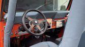 The cab features blue vinyl bucket seats and a matching rear bench. Additional equipment includes a padded six-point roll cage and an aftermarket locking center console.