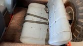 An aftermarket steering wheel sits ahead of a body-color dashboard with a blue plastic pad. Instrumentation is framed by a polished bezel and includes a 90-mph speedometer and auxiliary gauges. An aftermarket 8k-rpm tachometer is mounted below the dash, and the five-digit odometer shows 40k miles.