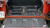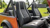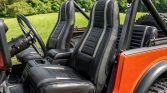 The interior is outfitted with replacement front bucket and rear bench seats upholstered in black vinyl with tan accents along with a replacement locking center console with a padded armrest. An aftermarket AM/FM stereo with an auxiliary input is installed along with 6×9 Kicker speakers in the rear and a Kicker amplifier mounted in the rear cargo area.