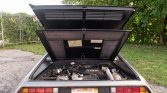 The Giugiaro-styled bodywork features brushed-stainless-steel panels and urethane front and rear fasciae mounted on a composite underbody and a Lotus-derived steel chassis. Features include gullwing doors, gray scotch-cal side stripes, a grooved hood, a front spoiler, and dual exhaust outlets. The rear window louver was repaired and a factory reinforcement bracket was fitted, and the headlights and hood and trunk struts were replaced in 2020. The seller states the car was ordered with a right-front fender-mounted antenna, but the system was replaced with an integrated interior component.