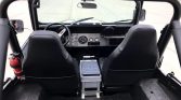The interior of the body tub is finished in black bed liner and is fitted with black vinyl Bestop bucket seats. Three-point seatbelts and a fire extinguisher are mounted to the black-painted roll cage. Additional interior details include an Igloo center console, a Hurst shifter, aftermarket speakers, and a JVC Bluetooth head unit.