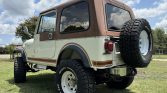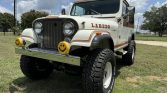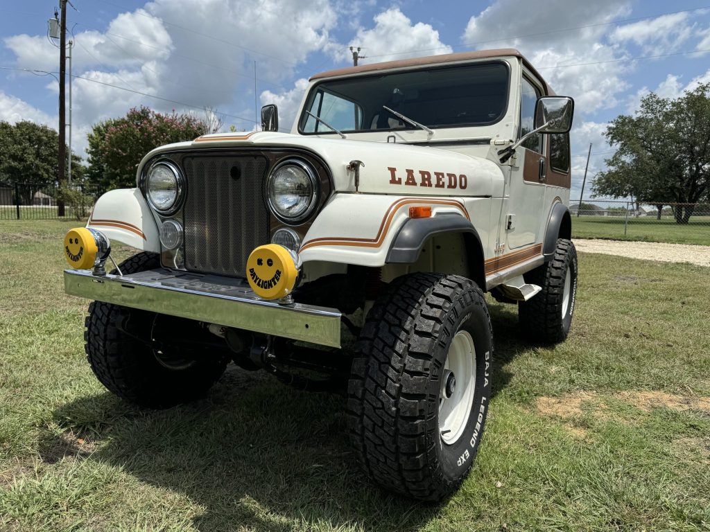 This 1983 Jeep CJ-7 Laredo is provided by a 4.2-liter inline-six linked with a four-speed manual transmission and a two-speed transfer case, and it is finished in Olympic White with a brown removable hardtop over Nutmeg vinyl. The truck rides on a lifted suspension and is further equipped with 15″ steel wheels, manually locking front hubs, auxiliary driving lights, side steps, and a tow ball as well as air conditioning, a roll bar, a locking center console, and an aftermarket head unit.