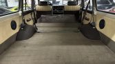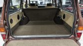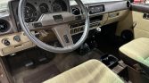 The front bucket seats and a folding rear bench are upholstered in patterned tan cloth with brown vinyl sides. Equipment includes air conditioning, a center console, a rear window defroster, and a Blaupunkt stereo linked to aftermarket speakers. The selling dealer reports the air conditioning system has been converted to utilize R134a refrigerant, and the driver’s seat was reupholstered in June 2011.