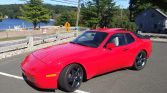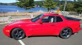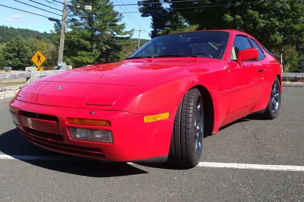 This 1986 Porsche 944 Turbo is powered by a turbocharged 2.5-liter inline-four paired with a five-speed manual transaxle and is finished in red over gray upholstery. Equipment includes a power-operated removable sunroof panel, a Blaupunkt cassette stereo, and bodyside moldings, while modifications include 18” Turbo Twist wheels, a hybrid Porsche/Huntley Racing ball-bearing turbocharger, a Huntley Racing exhaust system with a carbon-fiber muffler, and Rennline Turbo-script door sill guards.