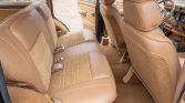 The cabin feature seating surfaces that have been re-trimmed in tan leather with corduroy inserts, matching door panels, replacement brown carpets, and a wood-trimmed dash. Amenities include power-adjustable front seats, electric windows, cruise control, air conditioning, and a Bluetooth-capable Sony stereo with USB and auxiliary inputs.