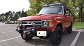 This 1987 Toyota Land Cruiser FJ60 was modified under prior ownership with a GM 5.7-liter V8 that is paired with a replacement five-speed manual transmission and a dual-range transfer case. Finished in red over black and gray vinyl, it is equipped with LED headlights, a winch, aftermarket 17″ wheels, manually-locking front hubs, lifted Old Man Emu suspension, electronic fuel injection, a roof rack, a Thule bike rack, steel bumpers, a swing-out tire carrier, air conditioning, and a Bluetooth-capable stereo.
