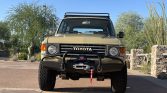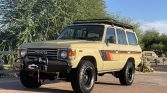 This 1987 Toyota Land Cruiser FJ60 is finished in tan with multicolor graphics over a tan and brown cloth and vinyl interior and is powered by a 4.2-liter inline-six linked with a four-speed manual transmission and a dual-range transfer case. Additional equipment includes an Old Man Emu lift kit, a 4PlusProducts front bumper, a Warn winch, a Land Cruiser Restorations roof rack, a Kenwood head unit, and air conditioning.