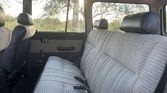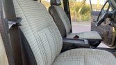 The cabin features front bucket seats and a rear bench upholstered in striped tan cloth and vinyl trim along with brown carpets and a brown and tan dashboard and door panels. The truck features a Kenwood head unit, and the air conditioning system has reportedly been converted to utilize R134a refrigerant.