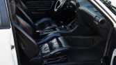 The interior features front sport seats and a rear bench upholstered in black leather along with matching door panels and carpeting. Features include cruise control, power windows, a Turner Motorsports shift knob, an onboard computer, M3-branded floor mats, and an aftermarket Alpine stereo.
