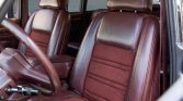 The cabin features power-adjustable front bucket seats trimmed in burgundy leather with cloth inserts along with a matching dashboard, rear bench, door panels, and carpeting. Amenities include air conditioning, cruise control, power accessories, and a cassette player.