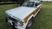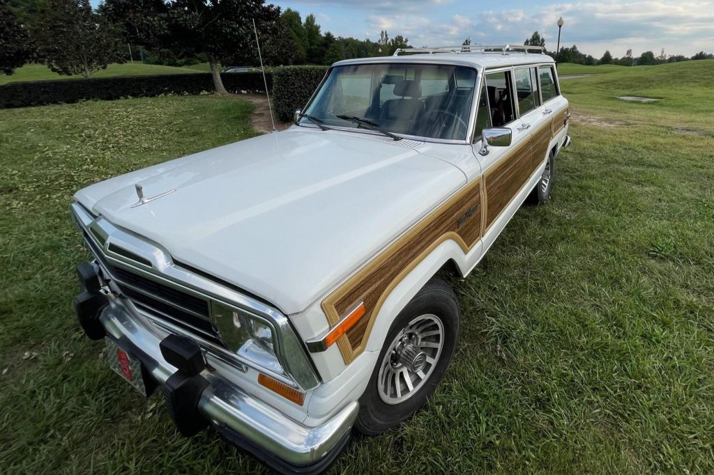 This 1988 Jeep Grand Wagoneer is finished in white with faux-wood paneling over a burgundy leather and cloth interior, and it is powered by a 5.9-liter V8 paired with a three-speed automatic transmission and a dual-range transfer case. Equipment includes 15″ alloy wheels, a roof rack, fog lights, power-adjustable front seats, power windows and locks, and a cassette stereo.