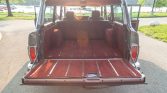 The cabin features seats upholstered in burgundy leather with corduroy inserts joined by matching door panels and carpeting protected by Grand Wagoneer embroidered floor mats. Equipment includes wood trim, air conditioning, cruise control, a central glovebox, and power windows and locks. The seller states that refurbishment work under previous ownership included the replacement of the driver’s seat upholstery, carpets, headliner, and rear window motor.