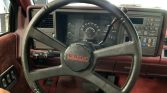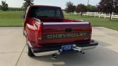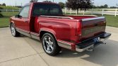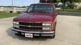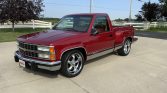 This 1990 Chevrolet C1500 Silverado is a regular-cab stepside pickup that is finished in red over matching cloth and powered by a 5.7-liter V8 paired with a four-speed automatic transmission. Equipment include 20″ aftermarket wheels, lowered suspension, bed rails, a drop-in bed liner, a Dynomax exhaust muffler with twin outlets, air conditioning, and a Delco cassette stereo.