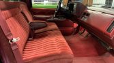 The cab features a split bench seat upholstered in red cloth with a matching dashboard, door panels, and carpets. Amenities include power windows and door locks, cruise control, air conditioning, and a Delco AM/FM cassette stereo with a digital equalizer. The seller states that the air conditioning system was serviced in preparation for the sale.