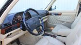 The seats are upholstered in tan leather with matching carpets and Zebrano wood trim on the doors, dashboard, and center console. Amenities includes automatic climate control, cruise control, power windows and locks, a Mercedes-branded Becker Grand Prix cassette stereo, and power-adjustable front seats and head restraints.