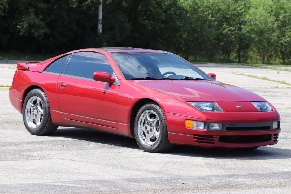 This 1991 Nissan 300ZX is finished in Cherry Red Pearl over a Charcoal leather and cloth interior, and it is powered by a twin-turbocharged 3.0-liter V6 paired with a five-speed manual transmission and a limited-slip differential. Additional equipment includes removable glass T-top roof panels, a power-adjustable driver’s seat, automatic climate control, cruise control, a Panasonic head unit, a Bazooka subwoofer, HICAS four-wheel steering, driver-adjustable shock absorbers, and chrome-finished 16″ alloy wheels. The car was first registered in California and later spent time in New Mexico and Michigan before being acquired by the current owner in 2021. Replacement accessory belts, tires, and front brake rotors and pads were reportedly installed in preparation for the sale.