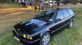 This 1992 BMW M5 Touring is one of just 891 produced worldwide and is finished in Diamond Black Metallic over M-Tech cloth. Power is supplied by a 3.8L S38B38 inline-six paired with a five-speed manual transmission and a limited-slip differential. Equipment includes an adaptive suspension, speed-sensitive power steering, dual-zone automatic climate control, a cassette stereo, power windows and mirrors, heated front seats, yellow-tinted high beams, fog lights, and 17″ Style 21 wheels.