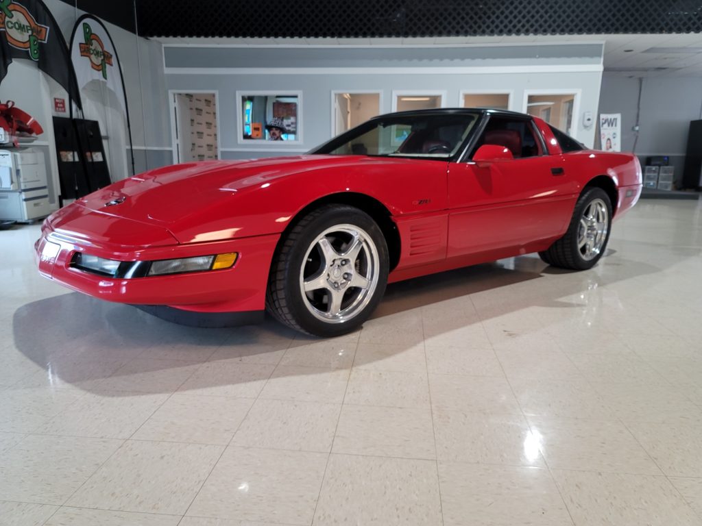 This Chevrolet Corvette ZR-1 is one of 502 produced for the 1992 model year and was acquired by the seller in September 2020. The car is powered by a 5.7-liter DOHC V8 paired with a six-speed manual transmission and finished in Bright Red over red leather. Features include the FX3 Selective Ride and Handling package, a transparent removable roof panel, power-adjustable sport seats, automatic climate control, and a Delco Bose CD/cassette stereo. The fuel injectors were replaced in October 2020.