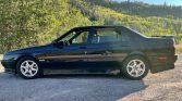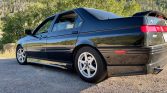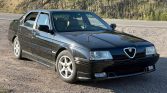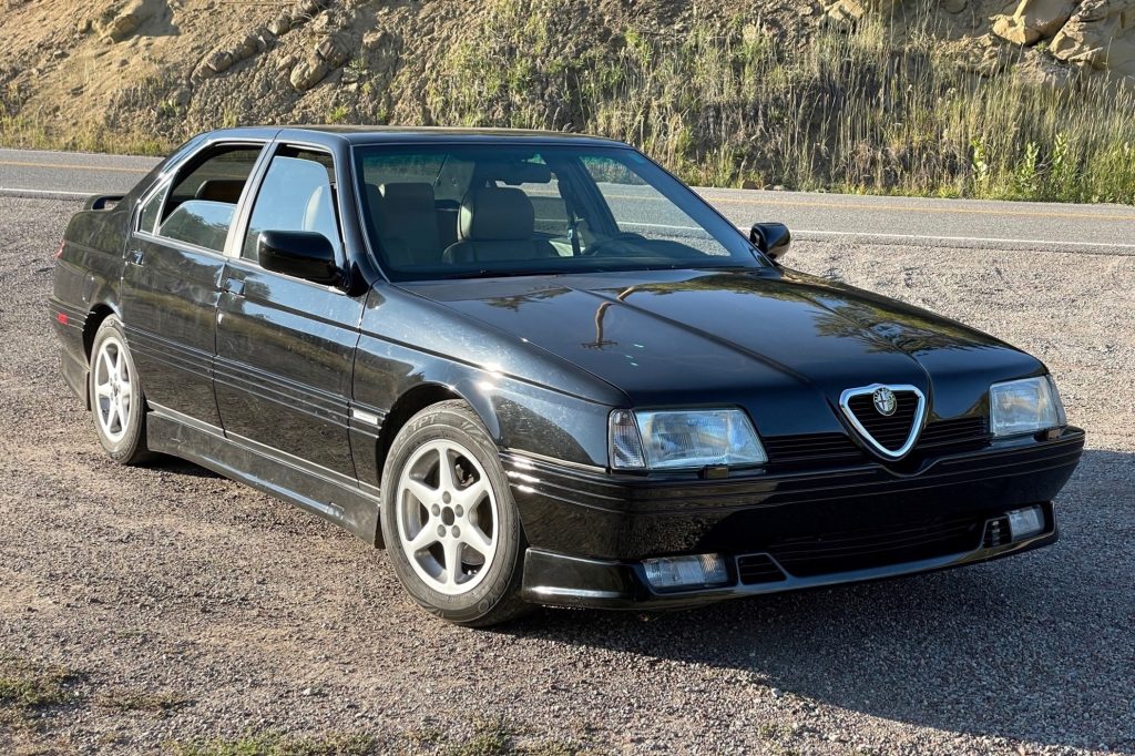 This 1994 Alfa Romeo 164 Quadrifoglio was originally sold by Algar Enterprises in Rosemont, Pennsylvania, and is finished in black over tan leather. Power is supplied by a 3.0-liter Busso V6 paired with a five-speed manual transaxle, and additional equipment includes a rear spoiler, a sunroof, cruise control, a cassette stereo, a six-disc CD changer, power-adjustable heated seats, fog lights, disc brakes, and 15″ Borbet wheels.