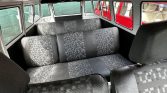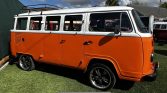 This 1994 Volkswagen Kombi was refurbished in Brazil before being imported to the US in March 2023. It is finished in white with orange vinyl wrapping on the lower half over black patterned upholstery and powered by an air-cooled 1.6L flat-four paired with a four-speed manual transaxle. Equipment includes 17″ aftermarket wheels, rack-and-pinion power steering, front disc brakes, right-side barn doors, a roof rack, three rows of bench seating, and an aftermarket head unit.
