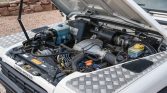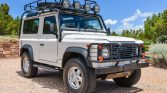 This 1995 Land Rover Defender 90 is one of approximately 500 North American-Specification station wagon examples imported into the US for the model year and is finished in Alpine White over Ash Gray Houndstooth cloth and vinyl. Equipment includes a roll cage, a roof rack, a front brush guard, a pop-up glass sunroof, auxiliary lights, 16″ five-spoke wheels, and tubular side steps along with air conditioning, an AM/FM/cassette stereo, and inward-facing rear jump seats. Power is provided by a 3.9-liter V8 linked with a five-speed manual transmission and a dual-range transfer case.