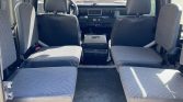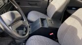 The cabin features seats upholstered in gray vinyl and cloth along with a matching dashboard and door panels. Equipment includes air conditioning, an analog clock, four rear jump seats, sliding rear quarter windows, and a locking center console with an inset AM/FM/cassette stereo.