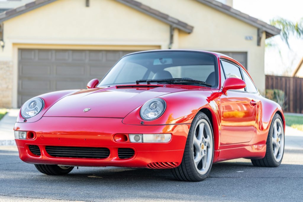 This 1995 Porsche 911 Carrera coupe is powered by a 3.6-liter flat-six paired with a six-speed manual transaxle and a limited-slip differential, and it is finished in Guards Red over black leather. Modifications include a Steve Wong ECU chip, Euro-spec bumpers and side skirts, a Fister muffler, and Bilstein suspension components resulting in a lowered ride height. Alloy 18″ Turbo-Twist alloy wheels are mounted, and additional equipment includes integrated driving lights, power-operated front hardback sport seats, air conditioning, cruise control, and a Porsche cassette stereo.