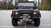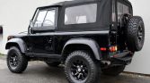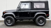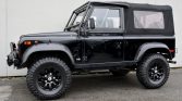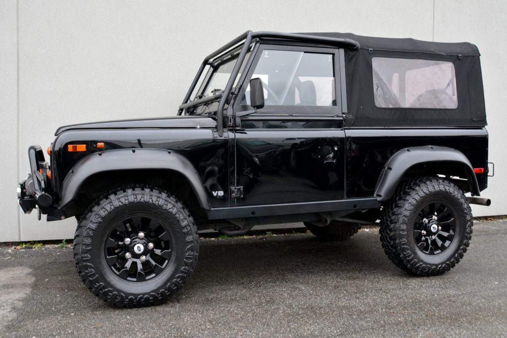 This 1997 Land Rover Defender is one of approximately 2,500 North American-specification examples produced for the model year and spent time in West Virginia and the Southeastern US before being brought to British Columbia in 2009. Finished in black with a matching fabric top over a gray cloth interior, the truck is powered by a 4.0-liter V8 paired with a four-speed automatic transmission and a two-speed transfer case. Modifications include a suspension lift, black-finished alloy wheels, a Warn winch, LED lighting, and an aftermarket audio system with locking speaker enclosures and a subwoofer.