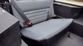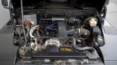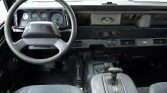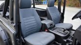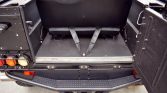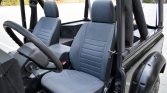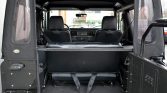 The truck was refinished in its factory shade of Beluga Black during prior ownership. NAS Defenders feature aluminum bodywork as well as external/internal cages. Modifications include aftermarket fender flares, a tubular front bumper that holds a Warn HS9500i winch with a synthetic line, J.W. Speaker LED headlights, and additional side marker lights on the front fenders. A black Badger Coachworks fabric top with plastic side and rear windows is fitted.