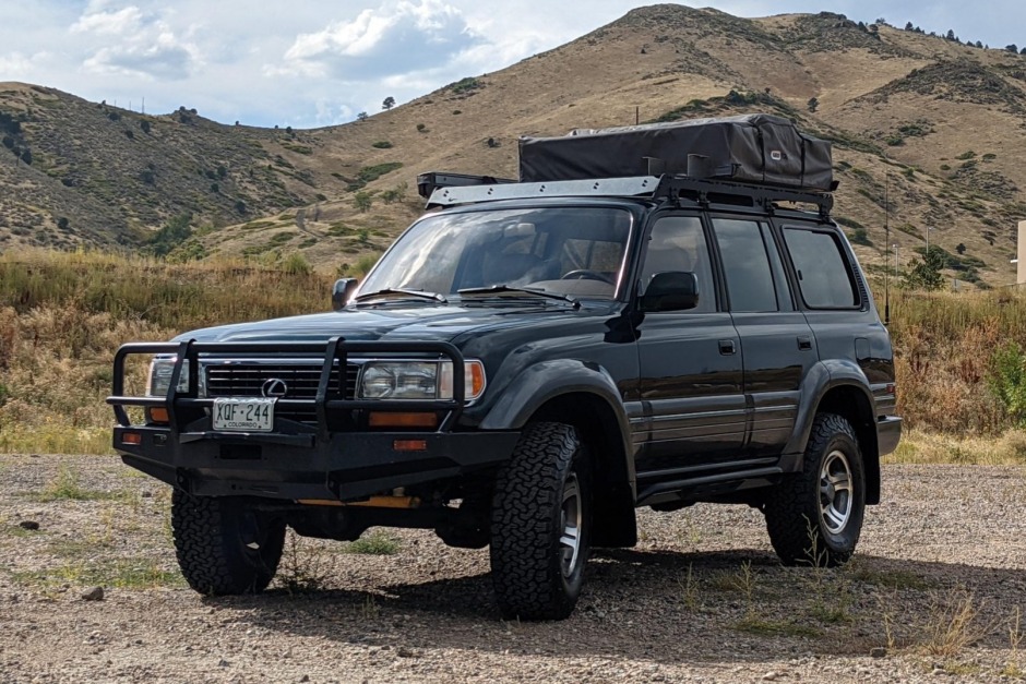 This 1997 Lexus LX450 is finished in Dark Emerald Pearl over beige leather and powered by a 4.5-liter inline-six paired with a four-speed automatic transmission, a dual-range transfer case, and a locking center differential. Equipment includes an ARB front bumper, a roof rack, an ARB roof tent and awning, rock sliders, lifted Old Man Emu suspension, ham and CB radios, a dual-battery system, and an aftermarket Pioneer CD stereo.