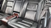 The cabin features seating trimmed in black Nappa leather with matching carpets, and burl wood veneers aLent the dashboard, center console, and door panels. Amenities include heated and power-adjustable front seats, an electric rear window shade, dual-zone automatic climate control, cruise control, and a Mercedes-Benz Exquisit cassette stereo.