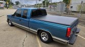 This 1998 Chevrolet C1500 Silverado is an Extended Cab pickup finished in Medium Blue Green and Light Pewter Metallic that has been fitted with a suspension lowering kit, window tint, and a tonneau cover. The truck is powered by a 4.3-liter Vortec V6 linked with a four-speed automatic transmission and a locking differential, and it is equipped with 15″ six-hole wheels, air conditioning, cruise control, a Bluetooth-capable Pioneer head unit, and two rows of bench seating trimmed in…