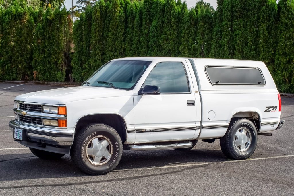 This 1998 Chevrolet K1500 Silverado 4×4 pickup now shows 56k miles with time spent in both Oregon and Hawaii. It is finished in Summit White over gray cloth and is powered by a 5.7-liter V8 linked with a four-speed automatic transmission and a dual-range transfer case. Features include an Airaid air-intake system, a Flowmaster exhaust system, a camper bed top, a receiver hitch, 16″ five-spoke alloy wheels, a power-adjustable split bench seat, an AM/FM stereo, a CD receiver, cruise control, and air conditioning.