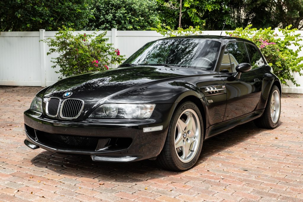 This 2000 BMW M Coupe is finished in black over black Nappa leather upholstery and is powered by a 3.2-liter inline six mated to a five-speed manual transmission and a limited-slip differential. Additional equipment includes 17″ Style 40 wheels, a Racing Dynamics front strut-tower brace, a Dinan exhaust system, a sunroof, cruise control, air conditioning, heated and power-adjustable seats, and a factory Harman Kardon audio system.