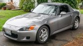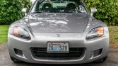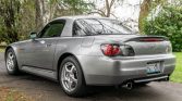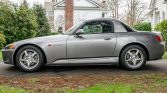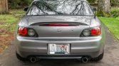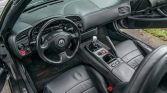 This 2000 Honda S2000 is finished in Silverstone Metallic over black leather. The car is powered by a 2.0-liter VTEC inline-four paired with a six-speed manual transmission and a limited-slip differential, and equipment includes 16″ five-spoke alloy wheels, a black convertible soft top, xenon headlights, air conditioning, cruise control, and a Kenwood stereo with aftermarket speakers, a subwoofer, and an amplifier.