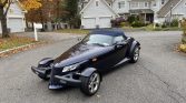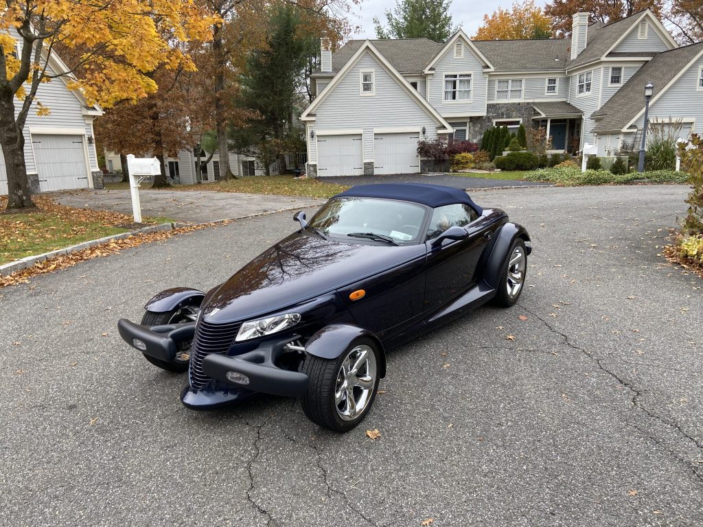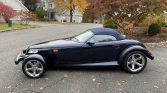 This 2001 Chrysler Prowler Mulholland Edition is finished in Prowler Midnight Blue with light blue pinstriping and a color-coordinated soft top, and it is powered by a 3.5-liter V6 paired with a four-speed automatic transaxle. Equipment includes staggered-diameter chrome-finished alloy wheels, air conditioning, cruise control, and an audio system with a six-disc CD changer and a cassette player.