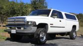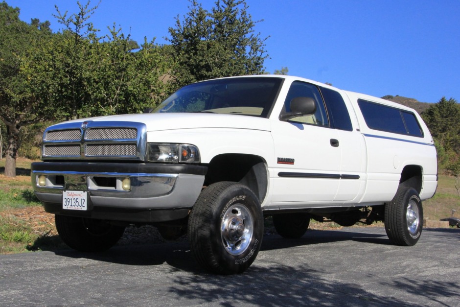 This 2001 Dodge Ram 2500 Laramie SLT Plus is a Quad Cab 4×4 example that was reportedly purchased new by the seller’s brother from Zangara Dodge of Albuquerque, New Mexico. The truck is finished in white over tan leather and is powered by a high-output 5.9-liter Cummins turbodiesel inline-six paired with a six-speed manual transmission, a dual-range transfer case, and a limited-slip rear differential. Equipment includes heated power-adjustable front seats, an aftermarket trailer brake controller, a backup camera, a color-matching camper shell, power windows and locks, air conditioning, cruise control, and an AM/FM/cassette/CD stereo.