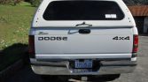 The truck is finished in Bright White and features a matching camper shell, a long bed with spray-in bedliner, fog lights, chrome-accented bumpers, aftermarket headlights, and a receiver hitch.