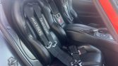 The cabin features seating upholstered in black leather with a matching dashboard, door panels, and carpets, the latter of which are protected by Viper-branded floor mats. Amenities include ACR five-point racing harnesses along with standard three-point seatbelts, air conditioning, a Hurst short shifter and shift knob, an aftermarket Pioneer stereo with navigation and a flip-up display, and remote keyless entry.
