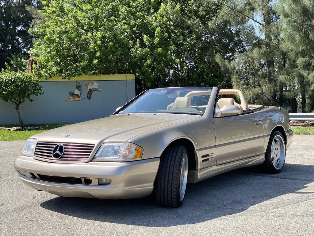 This 2001 Mercedes-Benz SL500 is finished in Desert Silver Metallic over beige Nappa leather and is powered by a 5.0-liter V8 paired with a five-speed automatic transmission. Equipment includes the AMG styling package, a removable hardtop, a replacement brown soft top, automatic climate control, a roll bar, heated multi-contour seats, xenon headlights, fog lights, and 18″ five-spoke AMG wheels.