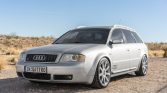 Silver 18″ RS6 wheels feature Audi center caps and are mounted with 235/40 Continental ExtremeContact DWS tires that show 2021 date codes. The suspension has been modified with H&R coilovers, and stopping power is provided by four-wheel disc brakes with multi-piston front calipers.
