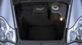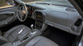 The power-adjustable front seats have embossed Porsche crests and are upholstered in Graphite Gray supple leather, while matching leather extends to the dashboard and door panels. Features include driver-seat memory settings, automatic climate control, cruise control, a Porsche CDR-220 stereo, red seatbelts, and metal accents on the door sills, shifter, and handbrake lever.