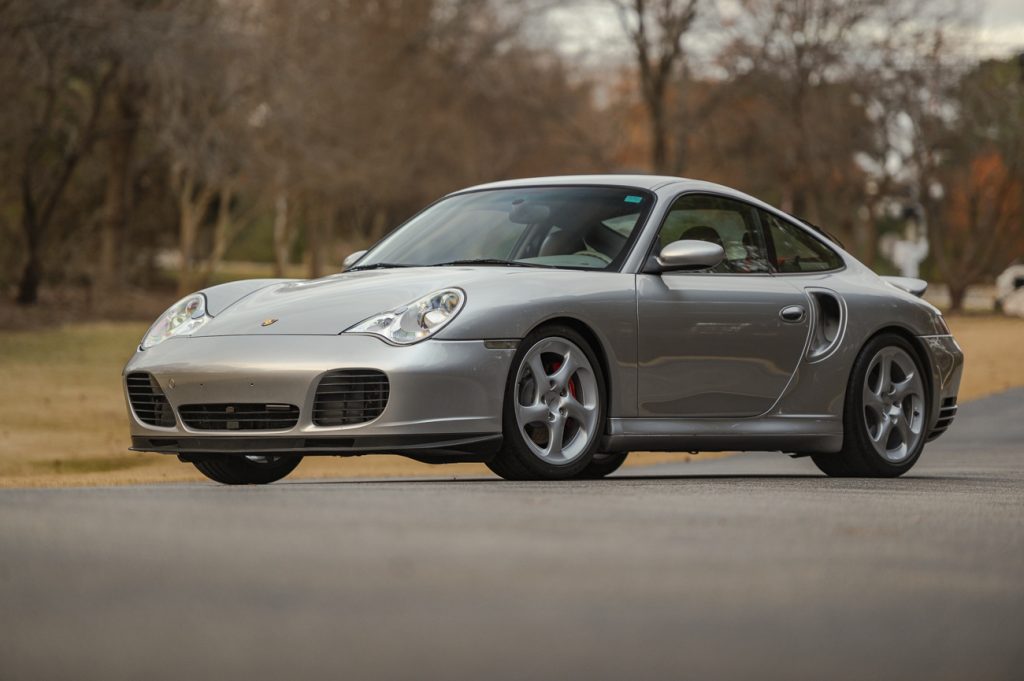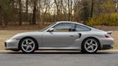 This 2002 Porsche 911 Turbo coupe is powered by a twin-turbocharged 3.6L flat-six that drives all four wheels via a six-speed manual gearbox, and it is finished in Arctic Silver Metallic over Graphite Gray full leather. Equipment includes 18″ Turbo Twist wheels, a speed-activated rear spoiler, bi-xenon headlights, automatic climate control, cruise control, a Porsche CDR-220 stereo, red seatbelts, and aluminum cabin accents.