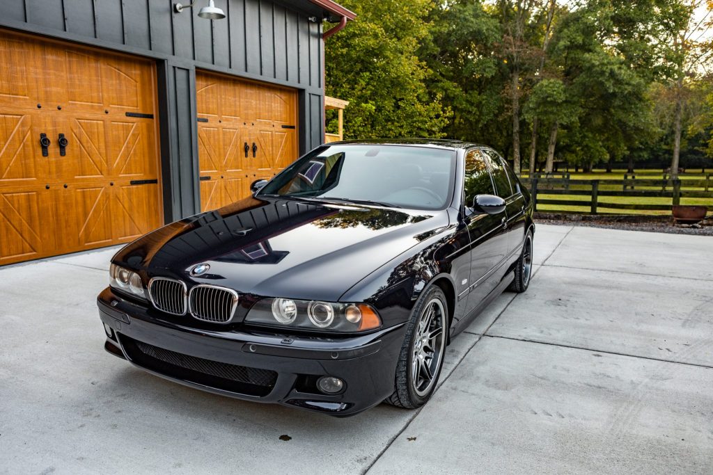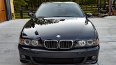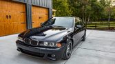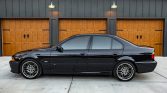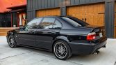 This 2003 BMW M5 is finished in Carbon Black Metallic over black Nappa leather and powered by a 4.9-liter V8 paired with a six-speed manual transmission. Features include a limited-slip differential, a Dinan exhaust system, 18″ Style 65 wheels, dual-zone automatic climate control, cruise control, navigation, a sunroof, power-adjustable and heated front seats, xenon headlights with washers, fog lights, and rain-sensing windshield wipers.