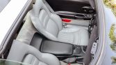The cabin features two power-adjustable bucket seats trimmed in Light Gray leather. Amenities include a head-up display, driver-seat position memory settings, dual-zone automatic climate control, an aftermarket shift knob, and cruise control. The car has been fitted with an aftermarket sound system that consists of an Alpine stereo with bluetooth capability, an Audison amplifier, aftermarket speakers, and a subwoofer.