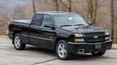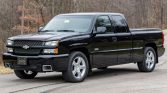 This 2003 Chevrolet Silverado SS extended-cab pickup has 53k miles on board. The truck is finished in black over Dark Charcoal leather, and a 6.0-liter Vortec V8 sends power to all four wheels via a four-speed automatic transmission and a full-time limited-slip center differential. Equipment includes the Trailering Package, 20″ five-spoke wheels, a hard tonneau cover, a bed mat, heated power-adjustable front bucket seats, power windows and door locks, a CD/cassette stereo, a Bose sound system, and dual-zone…
