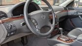 The cabin features seats upholstered in black Nappa leather with a matching dashboard, door panels, carpets, and floor mats along with burred walnut root aLents. The front seats are heated and power-adjustable with position memory, and other equipment includes dual-zone automatic climate control, cruise control, an electric rear-window roller blind, an alarm system, COMAND infotainment with navigation, and a CD changer. Signs of wear can be seen on the headlight-control surround and the steering-wheel buttons.