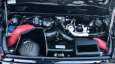 The twin-turbocharged 3.6L Mezger flat-six was factory rated at 415 horsepower and 415 lb-ft of torque. Modifications include an EVOMS V-flow air intake and turbocharger inlet ducts. An oil change was performed earlier this year, and a replacement oxygen sensor was reportedly installed in 2019.