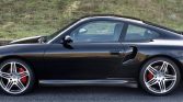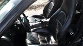 The cabin features power-adjustable and heated front seats upholstered in black draped leather along with a matching dash and door panels. Features include driver-seat memory settings, automatic climate control, an Alpine CD stereo, a Rockford Fosgate amplifier, a six-disc CD changer, Bose speakers, Porsche-script floor mats, and Turbo-script stainless steel sill guards.